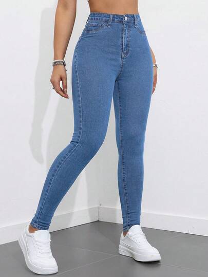 SHEIN ICON 女士高腰口袋修身休闲百搭牛仔裤 - 淺色水洗藍 - 查看 1