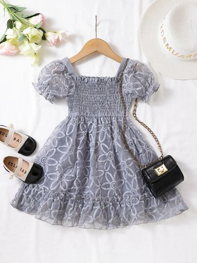 SHEIN 年輕女孩公主泡泡袖連身裙,帶有 3d 蝴蝶結和光滑緞面面料,適合演出、婚禮、晚會、生日派對 - 灰色 - 查看 3