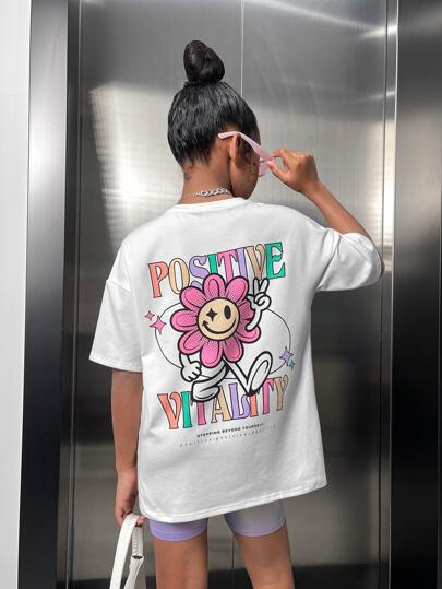SHEIN Tween女孩圓領短袖針織印花t恤 - 白色 - 查看 1