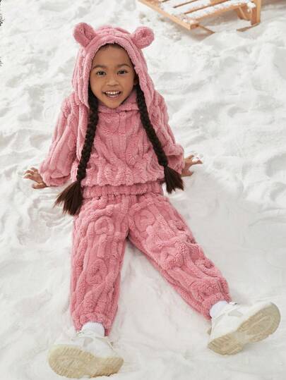 女小童3D耳朵設計法蘭絨連帽衫和褲子 - 粉色 - 查看 3