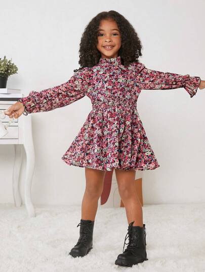 SHEIN Leap Crew 少女城市優雅立領花卉印花長袖洋裝,適用於春夏季 - 彩色 - 查看 1
