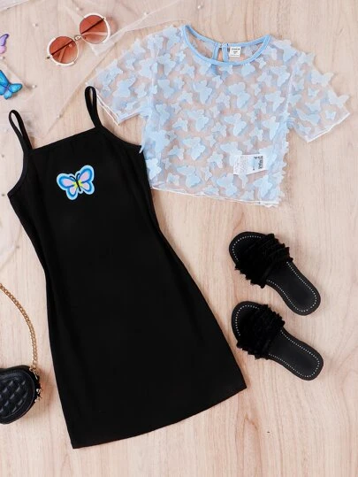 女孩蝴蝶貼花網紗上衣和吊帶洋裝 - 彩色 - 查看 6