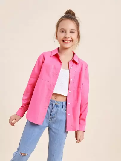 SHEIN 女孩雙口袋前紐扣襯衫 - 玫紅色 - 查看 1