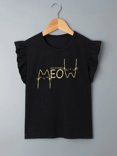 SHEIN 女孩字母和卡通圖案荷葉邊T恤 - 黑色 - 查看 1
