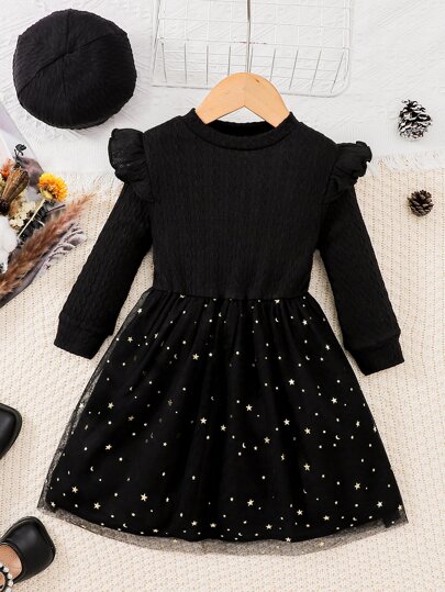 小女童拼接星星網紗荷葉邊洋裝 - 黑色 - 查看 1