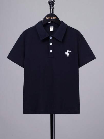 SHEIN 青少年男孩休閒經典鹿紋POLO衫,翻領款式 - 藏蓝色 - 查看 1