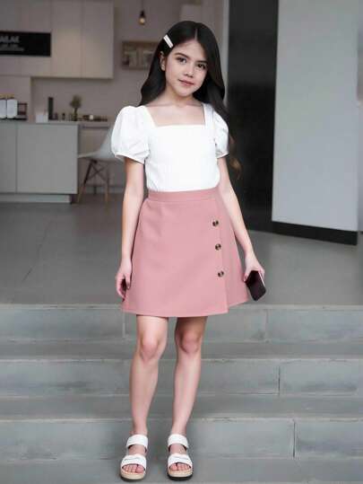 青少女純色泡泡袖上衣和裙子套裝 - 粉色 - 查看 1