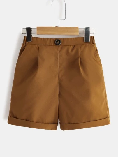 SHEIN 年輕男孩打褶細節捲邊短褲 - 棕色 - 查看 1