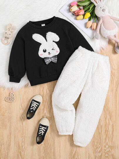 女小童蝴蝶結細節兔子刺繡套頭衫和絨毛長褲 - 黑色 - 查看 1