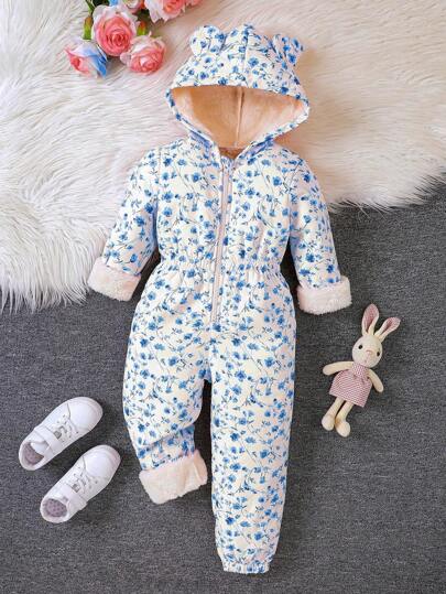 SHEIN 适合秋冬季的年轻女孩花卉印花连帽连体裤,配有 3D 耳朵和保暖内衬 - 藍色 - 查看 3