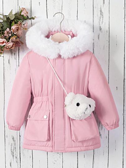 SHEIN 女童帶有彈性腰部帽裝墊棉外套 - 粉色 - 查看 1