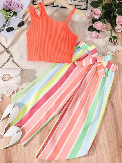 SHEIN 女孩不對稱領鏤空上衣和條紋圖案腰帶長褲 - 彩色 - 查看 1