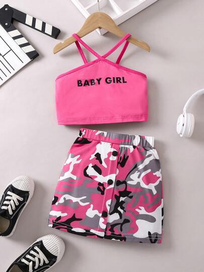 SHEIN 小女童字母圖案吊帶上衣和迷彩印花半身裙 - 彩色 - 查看 1