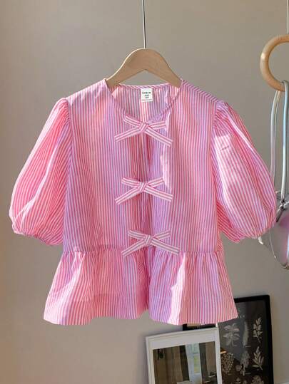 SHEIN LMoss Kids 青少年女孩休闲修身圆领纽扣荷叶边泡泡袖条纹衬衫,母女装,条纹上衣,返校装,娃娃装上衣,可爱上衣 - 淺粉色 - 查看 1