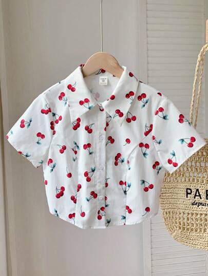 SHEIN LMoss Kids Tween 女童休闲可变领樱桃印花短款短袖衬衫 - 白色 - 查看 1