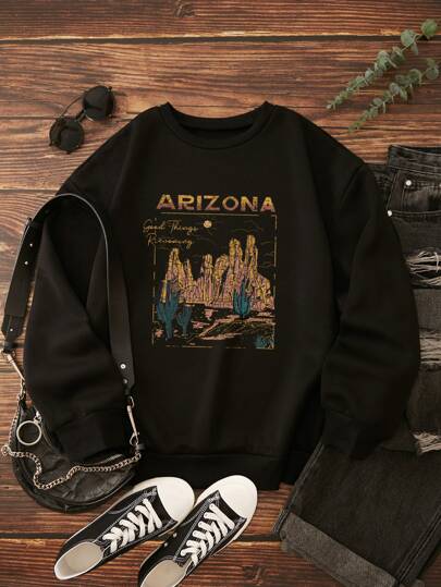 INAWLY 仙人掌和字母圖案保暖衛衣 - 黑色 - 查看 1