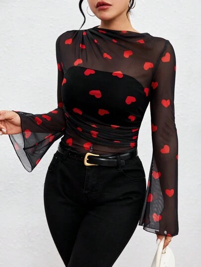 SHEIN LUNE 心型透明網紗波浪袖上衣 - 黑色 - 查看 1