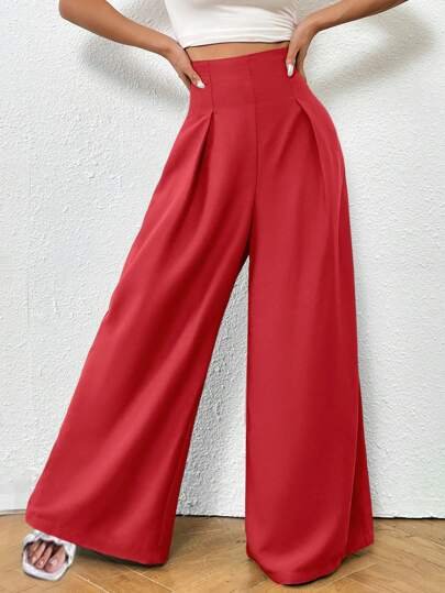 SHEIN LUNE 高腰拼接細節闊腿褲 - 紅色 - 查看 1