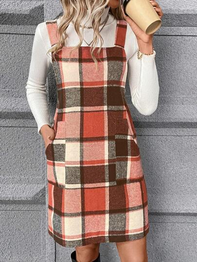 SHEIN LUNE 女士格紋修身背心裙,帶口袋 - 亮橙色 - 查看 1
