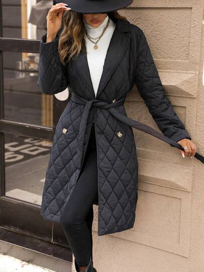 SHEIN LUNE 翻领领带绗缝加厚外套衣服冬季 - 黑色 - 查看 1