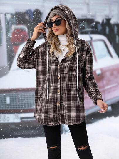 SHEIN LUNE 格紋印花落肩袖抽繩連帽外套 - 彩色 - 查看 4