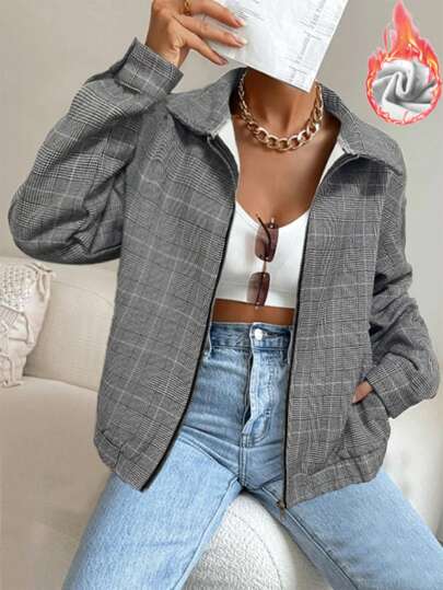 SHEIN LUNE 格紋印花拉鏈開襟落肩袖夾克 - 黑與白 - 查看 1