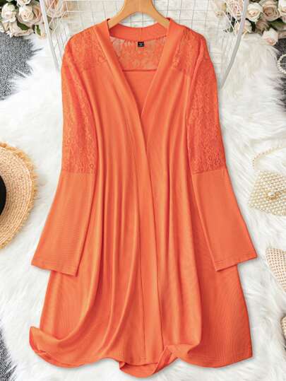 SHEIN LUNE 大碼蕾絲拼接開門襟外套 - 橘色 - 查看 1