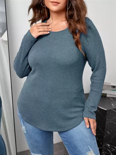 SHEIN LUNE 大碼弧形下擺華夫格編織T恤 - 霧霾藍 - 查看 1