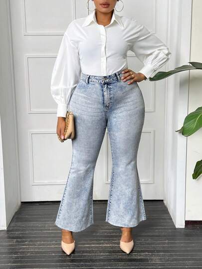 SHEIN LUNE 大碼高腰牛仔喇叭褲 - 淺色水洗藍 - 查看 1