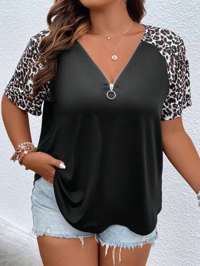 SHEIN LUNE 大碼豹紋印花插肩袖O形環細節T恤 - 黑色 - 查看 1
