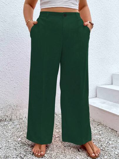 Calvaya 大碼素色斜口袋闊腿褲 - 墨綠色 - 查看 1