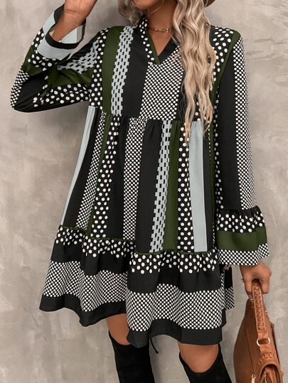 SHEIN LUNE 波點圖案荷葉袖荷葉邊娃娃裙 - 彩色 - 查看 1