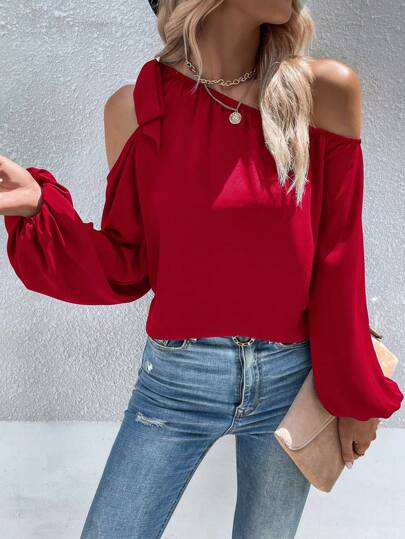 SHEIN LUNE 净色不对称肩部衬衫 - 酒紅色 - 查看 1