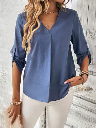 SHEIN LUNE 休閒鈕扣純色女士襯衫 - 霧霾藍 - 查看 1
