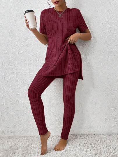 SHEIN LUNE 下擺開叉T恤和緊身褲 - 酒紅色 - 查看 1