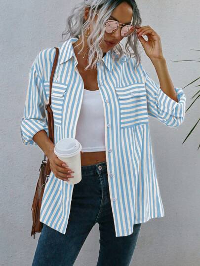 SHEIN LUNE 條紋印花落肩袖襯衫 - 淺藍色 - 查看 1