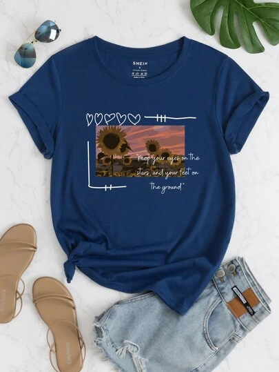SHEIN LUNE 向日葵和標語圖案T恤 - 藍色 - 查看 1