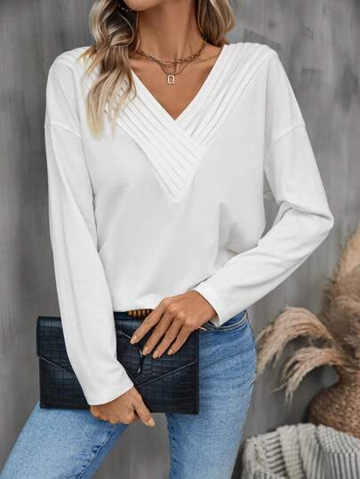SHEIN LUNE V領長袖上衣 - 白色 - 查看 1