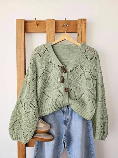 SHEIN LUNE 女士休闲纯色镂空针织开衫 - 綠色 - 查看 1