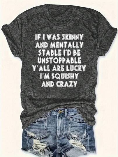 SHEIN LUNE 女装标语印花夏季深灰色圆领T恤 印花T恤 女式上衣 - 深灰色 - 查看 1