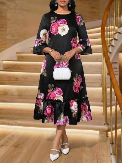 SHEIN Lady 浪漫优雅印花荷叶边连衣裙 - 黑色 - 查看 1