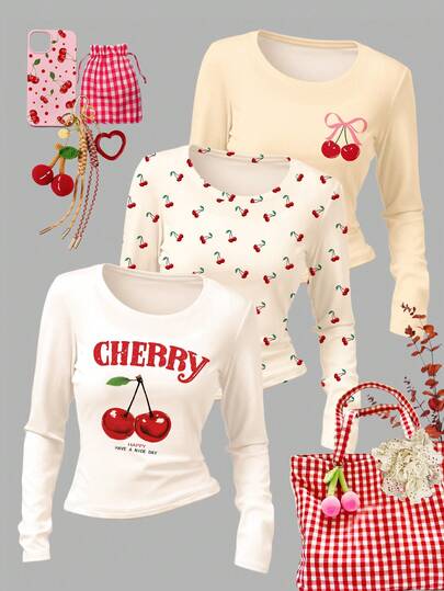 SHEIN Leap Crew 3 件复古迷你樱桃海滩图案 T 恤,多巴胺配色方案,奶油黄,奶油白,复古甜美,少女休闲修身高腰短款长袖 T 恤套装,适合秋冬季、所有季节、返校、音乐节、户外、休闲、街头风格、家居、校园
