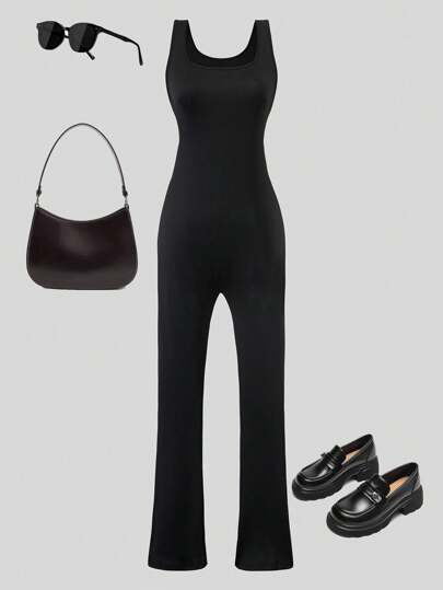 SHEIN 青少年女孩純色簡約日常連身衣 - 黑色 - 查看 1