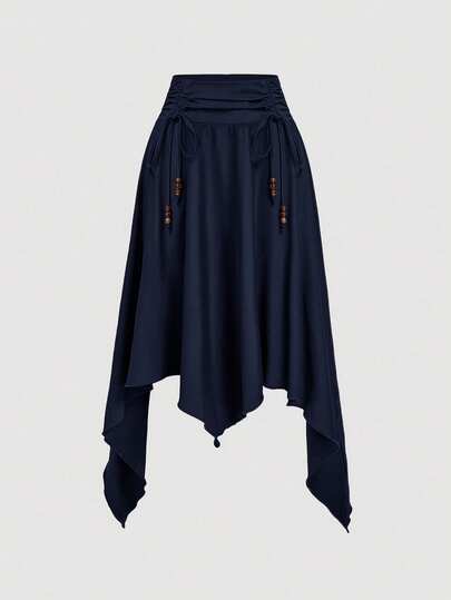 SHEIN MOD 不对称下摆串珠纯色半身裙 - 藏蓝色 - 查看 1