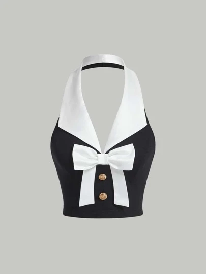SHEIN MOD 前蝴蝶結紐扣細節掛脖上衣 - 白色 - 查看 1