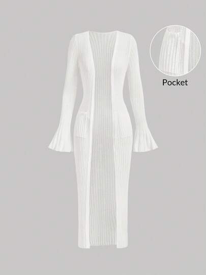 SHEIN MOD 米白色口袋喇叭袖修身开衫,返校季开衫,教师服装,复古女式毛衣,90年代时尚,校园开衫,秋冬开衫,学院风开衫,开学第一天,办公装,外出装,秋季毛衣,万圣节毛衣