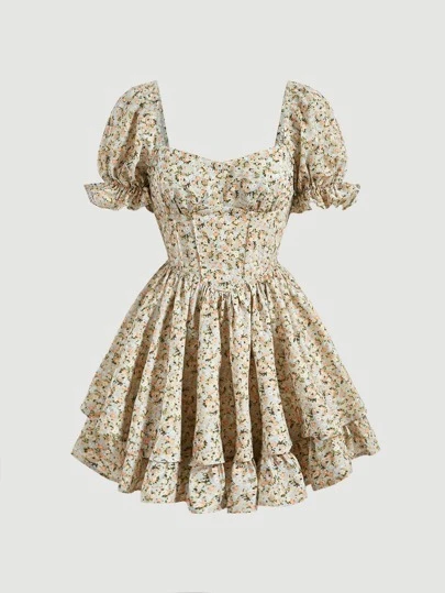 SHEIN MOD 碎花泡泡袖荷葉邊洋裝 - 彩色 - 查看 1