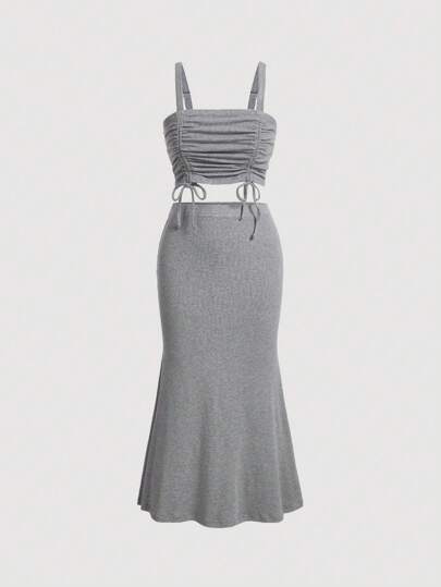 SHEIN MOD 前抽繩吊帶上衣&魚尾短裙 - 灰色 - 查看 1