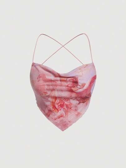 SHEIN MOD 人物印花垂領頭巾下擺吊帶上衣 - 粉色 - 查看 1