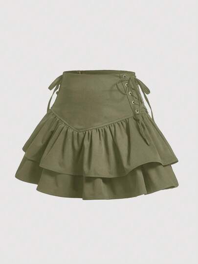 SHEIN MOD 側邊綁帶多層下擺半身裙 - 軍綠色 - 查看 1